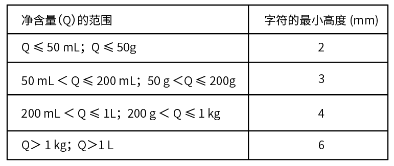 在中文字高應大于等于字符最小高度,kg、mL等單位或其他強制標示字符應按其中的大寫字母或“k、g、l”等小寫字母判斷是否大于等于字符最小高度。