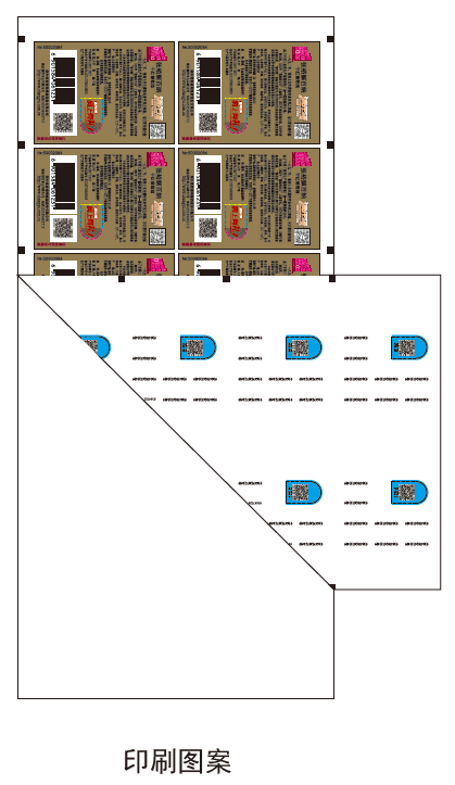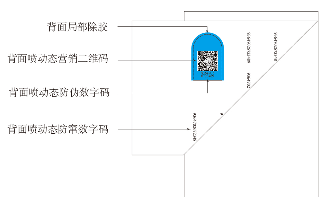 從圖中可以看到,標簽的正面噴印追溯二維碼,防偽數字碼和背面除膠區域噴印,其他背面區域噴印防竄數字碼,正面局部做了撕拉口設計。